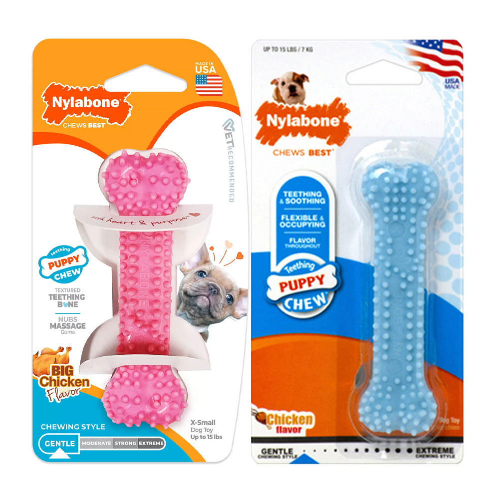 Encourage positive chewing habits from the start with our Puppy Chew Chicken Dog Chew Toy! This puppy teething toy satisfies your pup’s natural urge to chew with irresistible chicken flavor and soft, puppy-friendly material. Made just for teething puppies, its gentle nubs promote clean teeth and help control plaque and tartar. This dental chew toy is the perfect pastime for playful pups who could use some teething relief! Flexible chew toy helps with puppy teething while cleaning teeth and freshening breath.