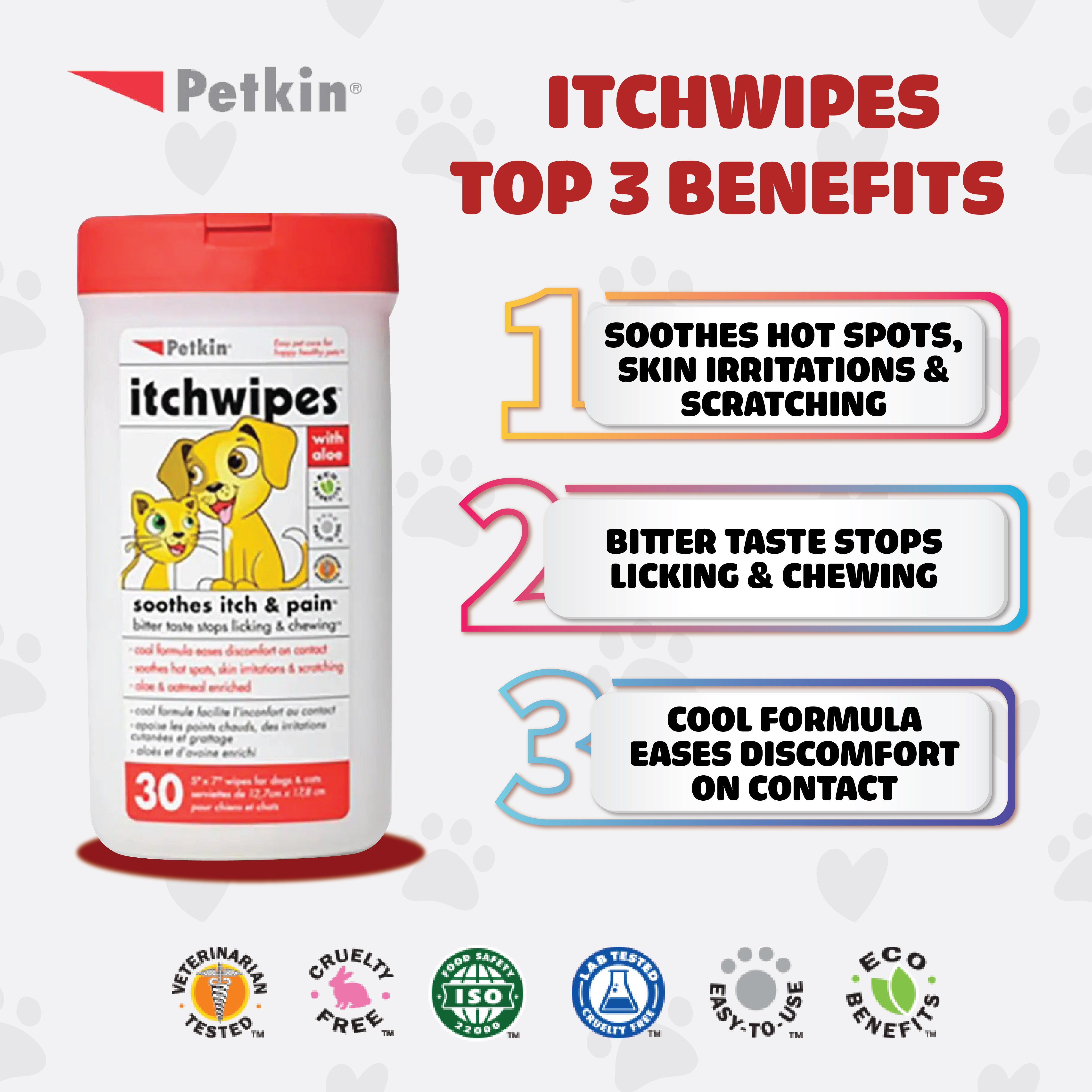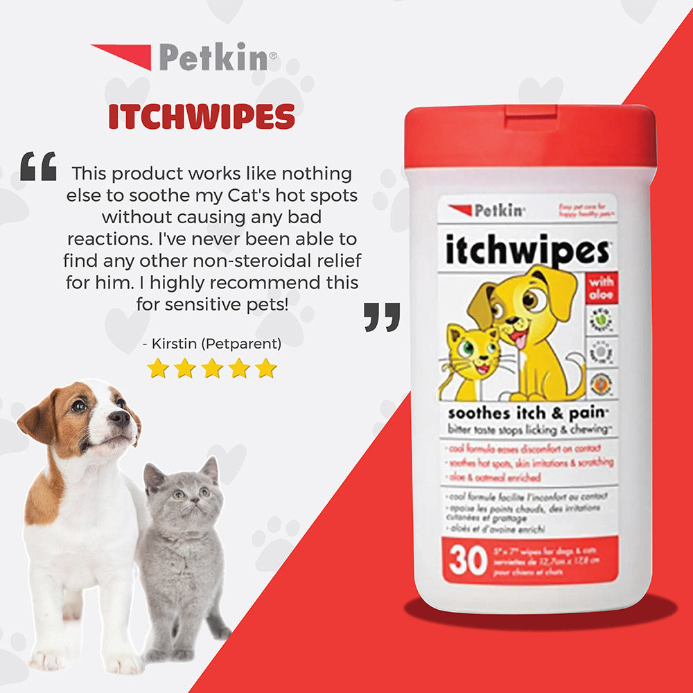 Itch Wipes provide an easy way to soothe your pet's itching and discomfort caused by hot spots, flea bites and skin irritations. The cool and soothing formula soothes itch and pain on contact to reduce your pet's scratching, licking and chewing. Bitter taste stops licking.