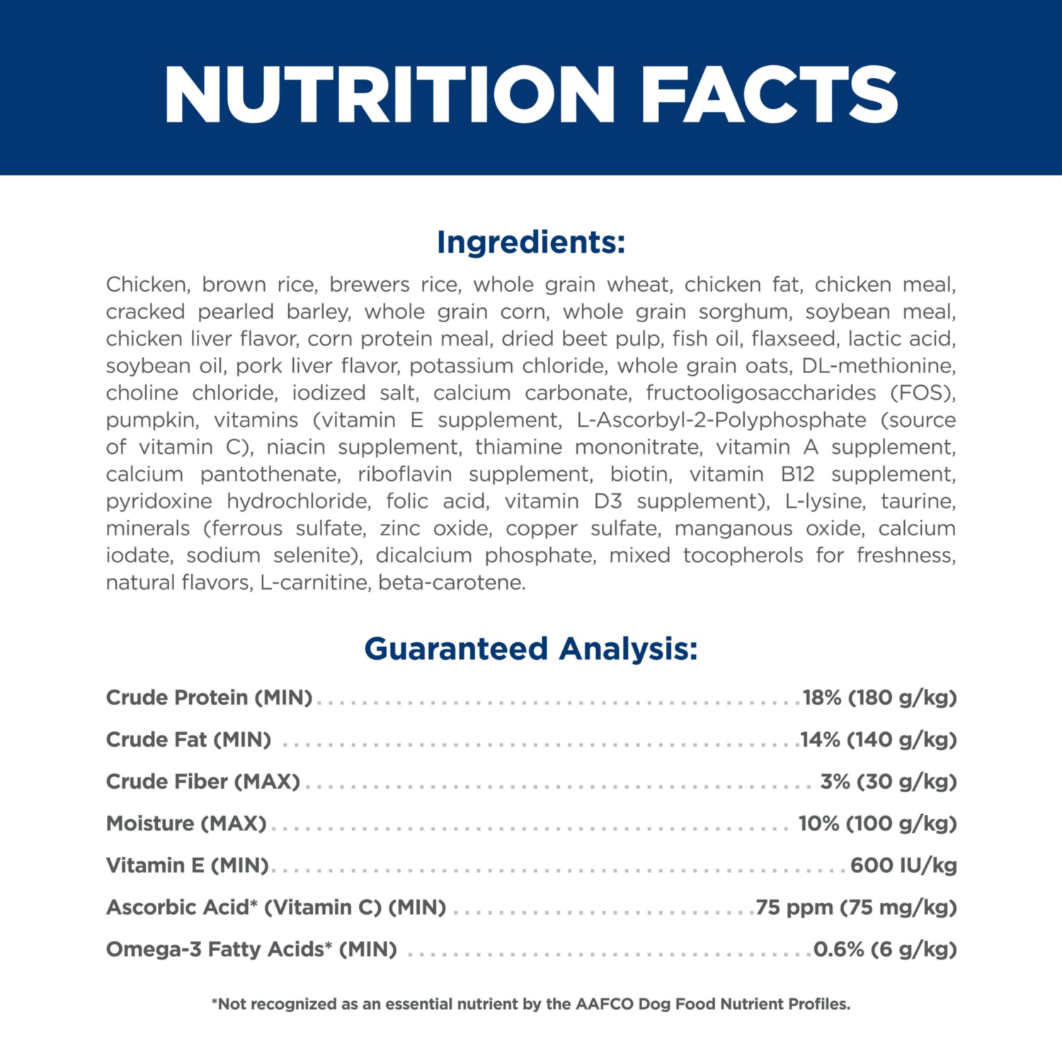 Chicken, Brown Rice, Brewers Rice, Whole Grain Wheat, Chicken Fat, Chicken Meal, Cracked Pearled Barley, Whole Grain Corn, Whole Grain Sorghum, Soybean Meal, Chicken Liver Flavor, Corn Protein Meal, Dried Beet Pulp, Fish Oil, Flaxseed, Lactic Acid, Soybean Oil, Pork Liver Flavor, Potassium Chloride, Whole Grain Oats, DL-Methionine, Choline Chloride, Iodized Salt, Calcium Carbonate, Fructooligosaccharides (FOS), Pumpkin, vitamins (Vitamin E Supplement, L-Ascorbyl-2-Polyphosphate (source of Vitamin C), Niacin Supplement, Thiamine Mononitrate, Vitamin A Supplement, Calcium Pantothenate, Riboflavin Supplement, Biotin, Vitamin B12 Supplement, Pyridoxine Hydrochloride, Folic Acid, Vitamin D3 Supplement), L-Lysine, Taurine, minerals (Ferrous Sulfate, Zinc Oxide, Copper Sulfate, Manganous Oxide, Calcium Iodate, Sodium Selenite), Dicalcium Phosphate, Mixed Tocopherols for freshness, Natural Flavors, L-Carnitine, Beta-Carotene.
