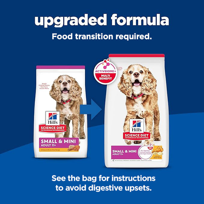 Big on Love, Small in Size. Hill's Science Diet Small & Mini Adult 11+ dry dog food is tailored nutrition to support healthy aging during Small & Mini dogs’ golden years. Specially made with nibble size kibble & contains prebiotic fiber for healthy digestion.