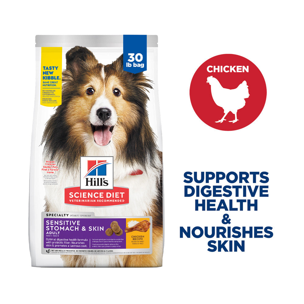 Hill's Science Diet Sensitive Stomach & Skin dry dog food provides optimal digestive health while nourishing skin & promoting a lustrous coat.