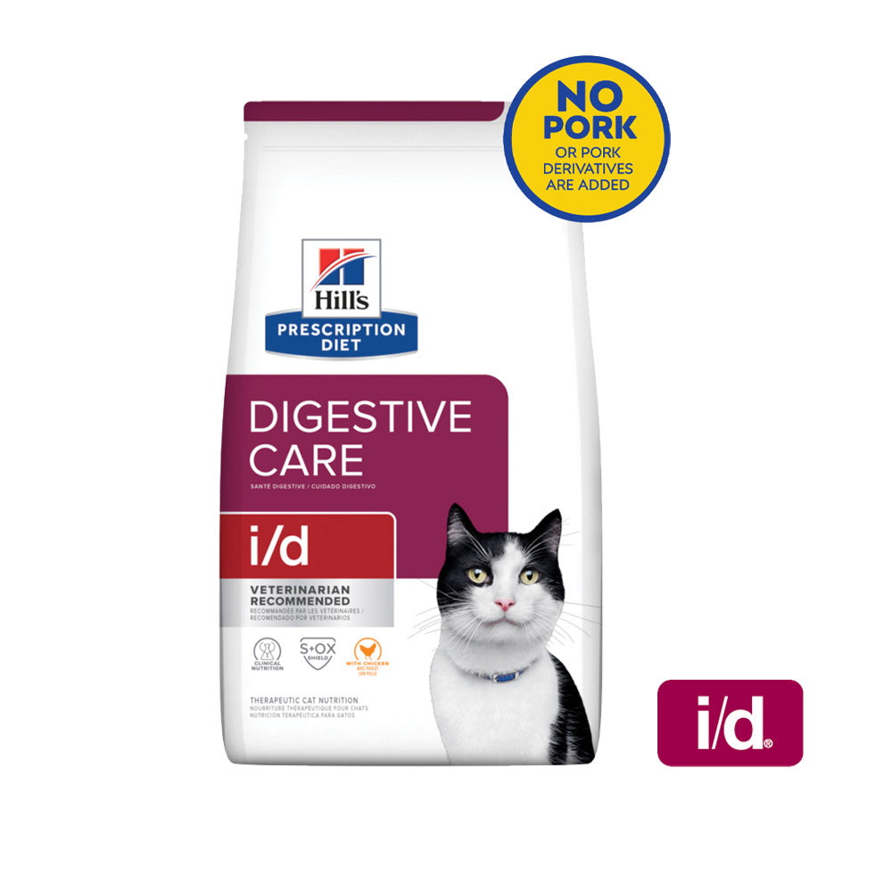 Hill's Prescription Diet i/d Dry Cat Food is great tasting nutrition specially formulated to support digestive health and promote optimal stool quality. In fact, it is clinically shown to help settle digestive upsets. This highly digestible formula is enriched with electrolytes and B vitamins to ensure easy nutrient absorption and replace lost nutrients. Fortified with Omega 3 & 6 fatty acids and clinically proven antioxidants to help support a healthy immune system.