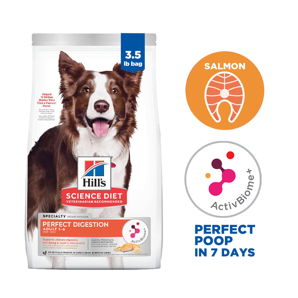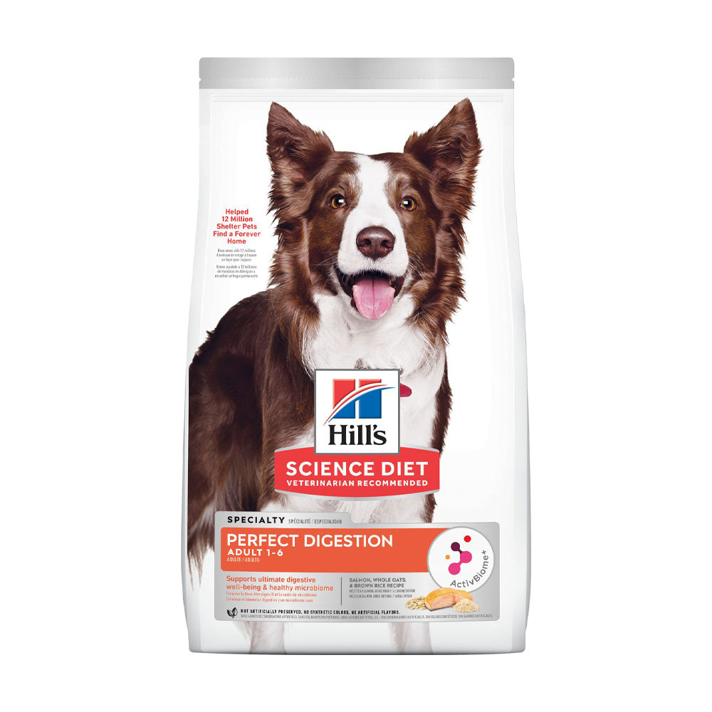 Hill's Science Diet Adult Perfect Digestion Salmon, Whole Oats, and Brown Rice Recipe Dog Food is formulated to meet the nutritional levels established by the AAFCO Dog Food Nutrient Profiles for maintenance of adult dogs.