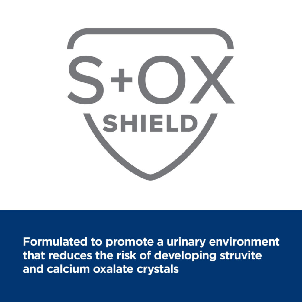 - S+OXSHIELD: Formulated to promote a urinary environment that reduces the risk of developing struvite & calcium oxalate crystals