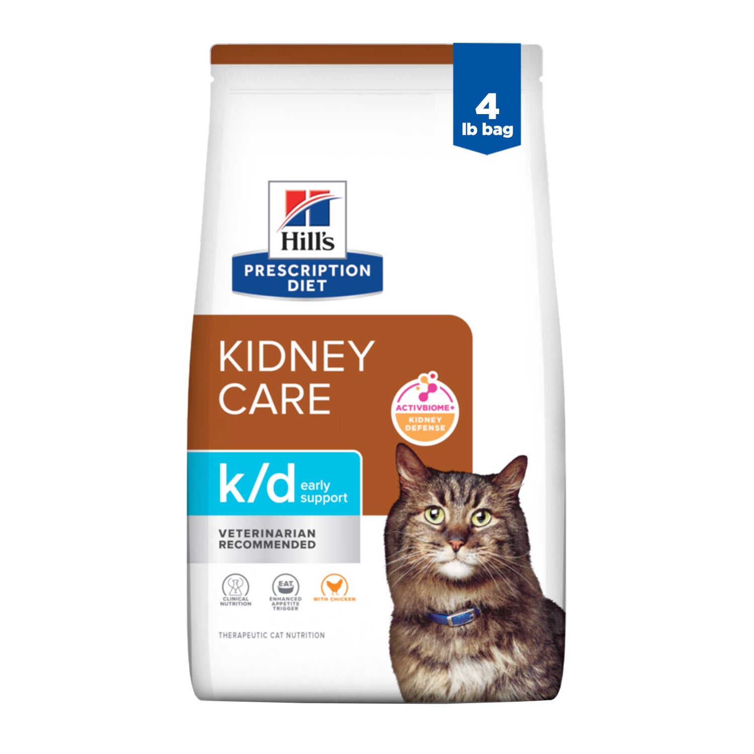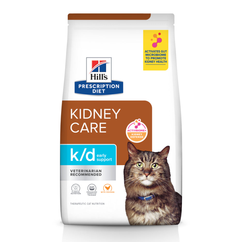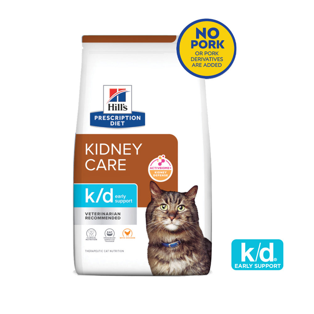 Hill's nutritionists and veterinarians developed Hill's Prescription Diet k/d Early Support clinical nutrition for early protection of a cat's vital kidney function and to encourage eating for strength and energy. This dry food is made with chicken and has an irresistible taste that your cat will love.