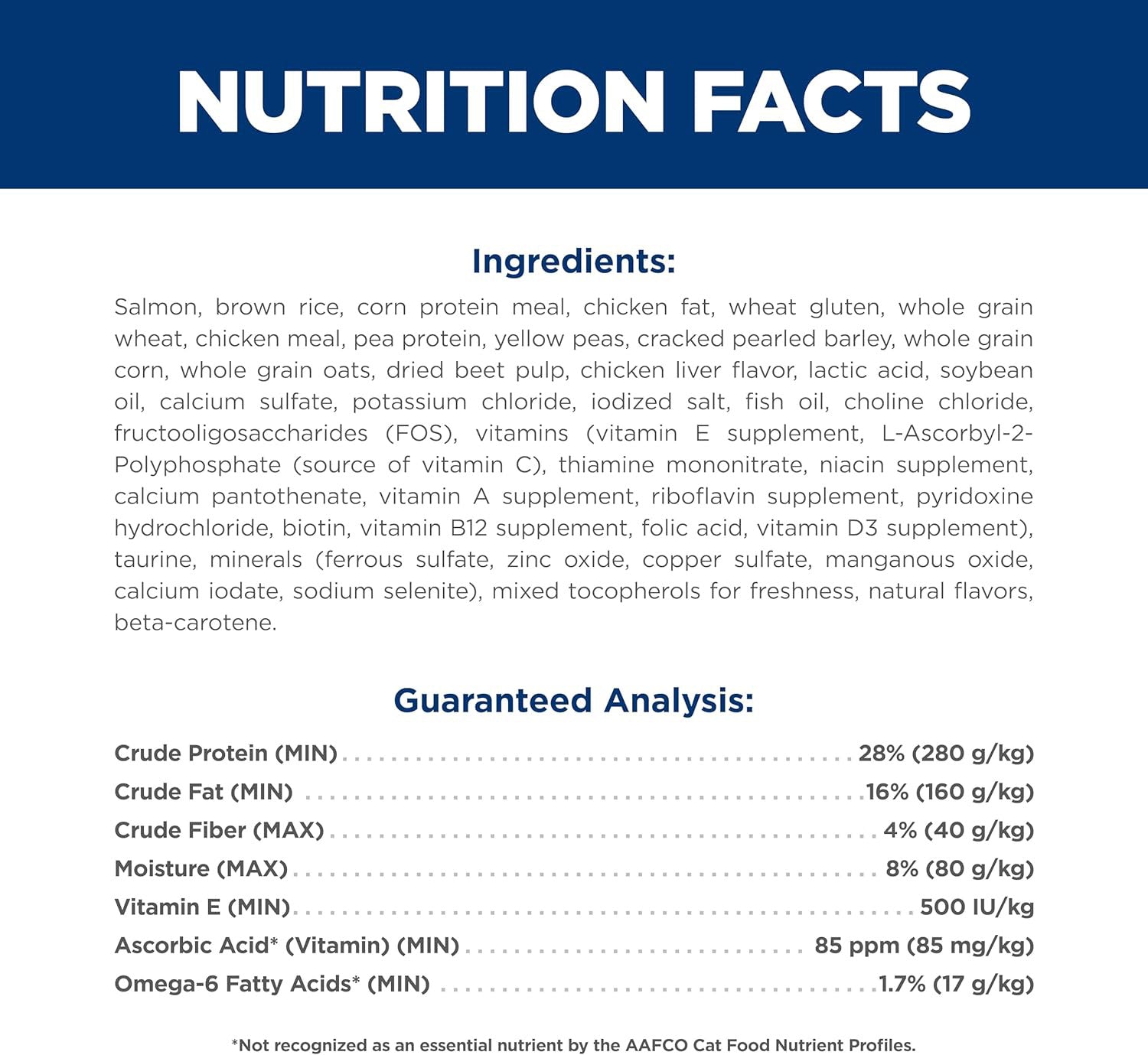Salmon, Brown Rice, Corn Protein Meal, Chicken Fat, Wheat Gluten, Whole Grain Wheat, Chicken Meal, Pea Protein, Yellow Peas, Cracked Pearled Barley, Whole Grain Corn, Whole Grain Oats, Dried Beet Pulp, Chicken Liver Flavor, Lactic Acid, Soybean Oil, Calcium Sulfate, Potassium Chloride, Iodized Salt, Fish Oil, Choline Chloride, Fructooligosaccharides (FOS), vitamins (Vitamin E Supplement, L-Ascorbyl-2-Polyphosphate (source of Vitamin C), Thiamine Mononitrate, Niacin Supplement, Calcium Pantothenate, Vitamin A Supplement, Riboflavin Supplement, Pyridoxine Hydrochloride, Biotin, Vitamin B12 Supplement, Folic Acid, Vitamin D3 Supplement), Taurine, minerals (Ferrous Sulfate, Zinc Oxide, Copper Sulfate, Manganous Oxide, Calcium Iodate, Sodium Selenite), Mixed Tocopherols for freshness, Natural Flavors, Beta-Carotene.