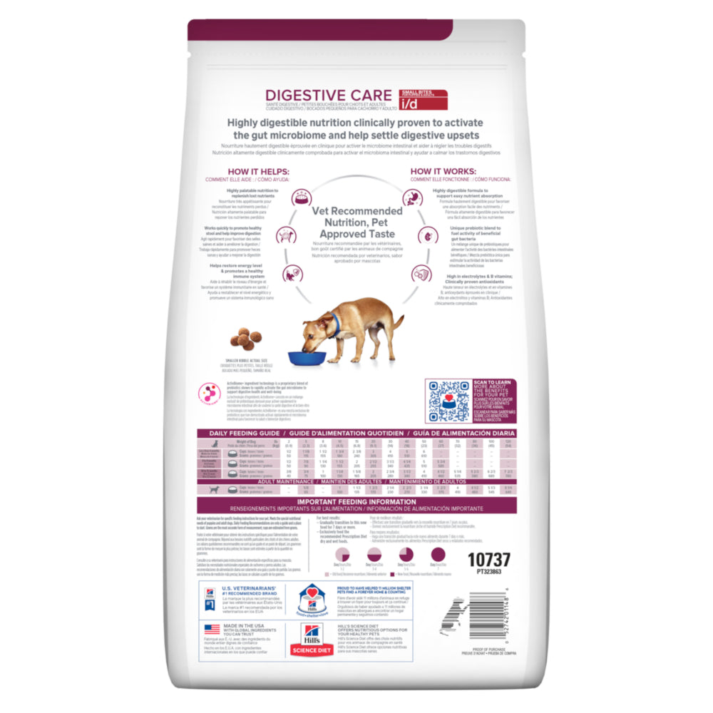 Hill's Prescription Diet i/d Small Bites Dry Dog Food provides all the nutrition your small dog needs. It is specially created in smaller kibble size to meet the need of your smaller dog or dogs which prefer smaller kibble. Please consult your veterinarian for further information on how our Prescription Diet foods can help your dog to continue to enjoy a happy and active life.