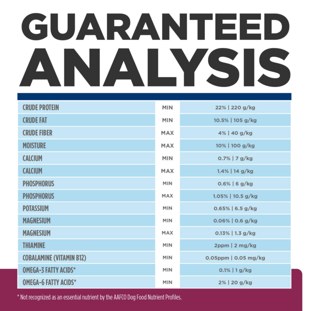 1The nutrient in the product after moisture is removed. It is used to make direct comparisons of nutrient profiles with differing moisture contents.