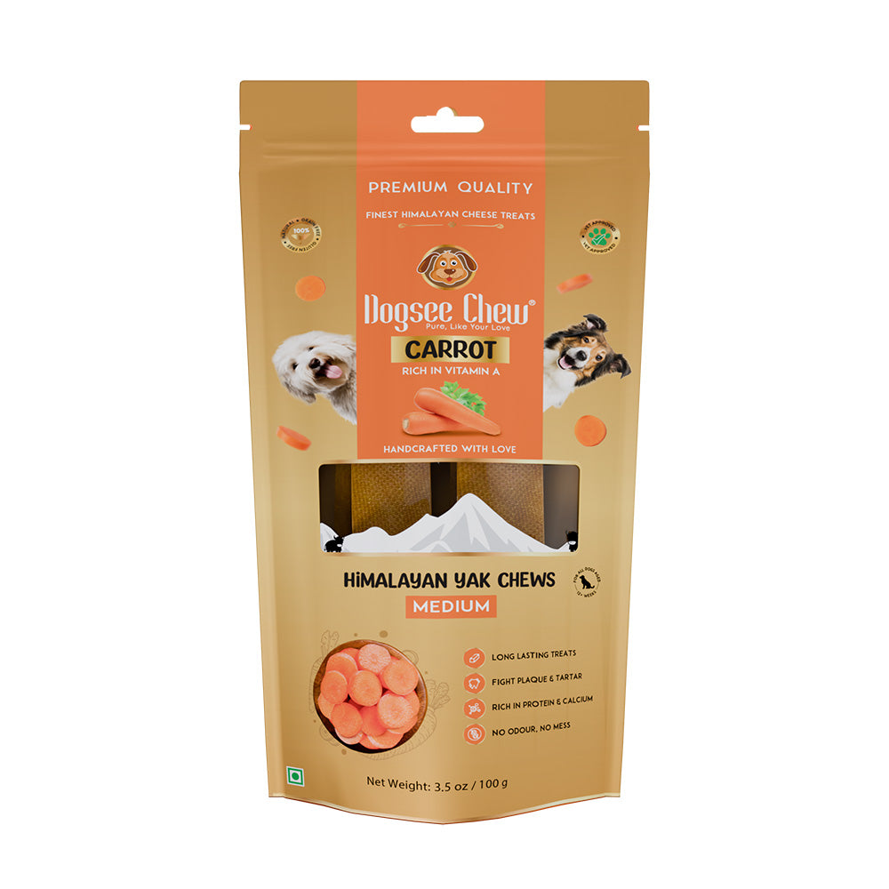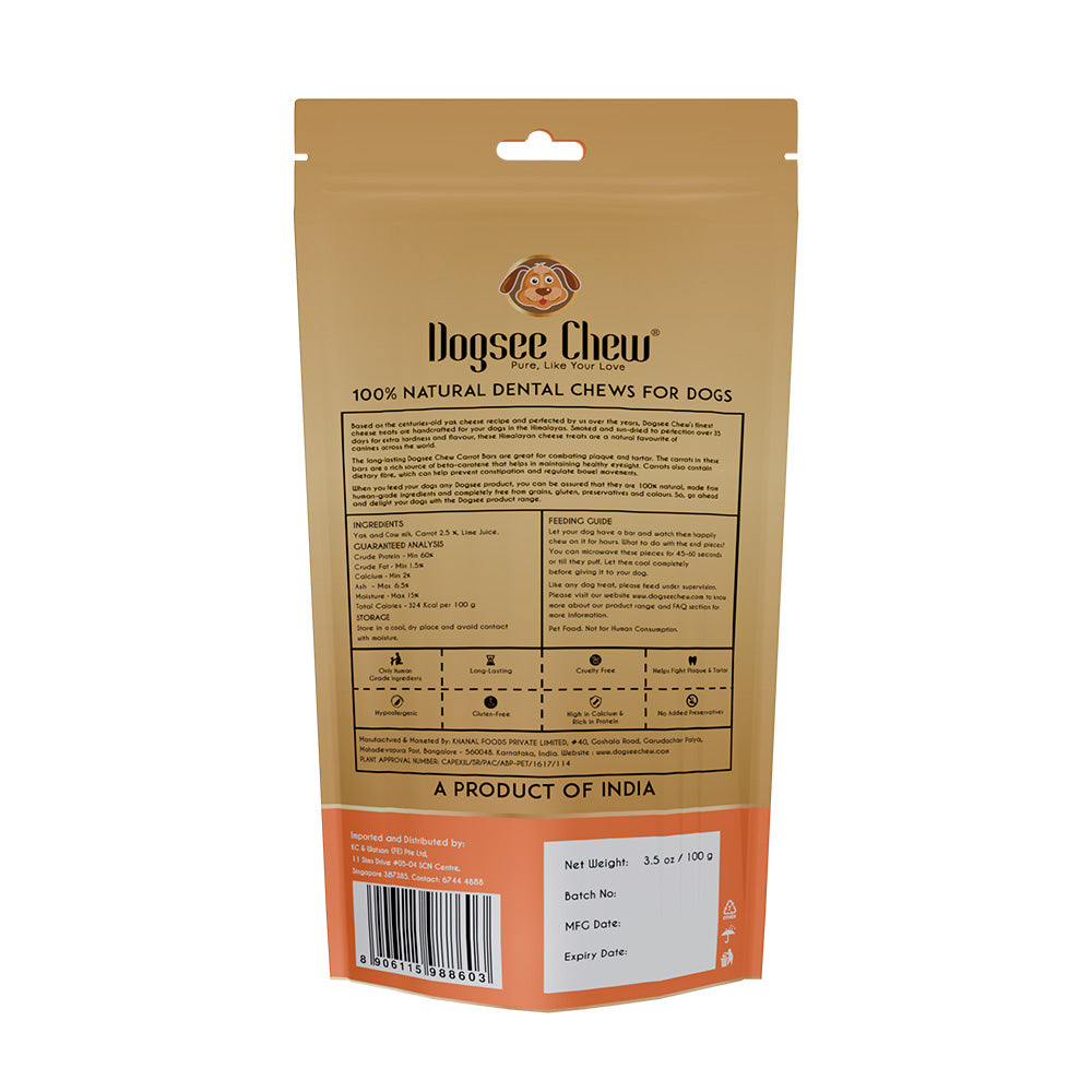 The long-lasting Dogsee Chew Carrot bars are great for combatting plaque and tartar. The carrots in these bars are a rich source of beta-carotene that helps in maintaining healthy eyesight. Carrots also contain dietary fibre, which can help prevent constipation and regulate bowel movements.
