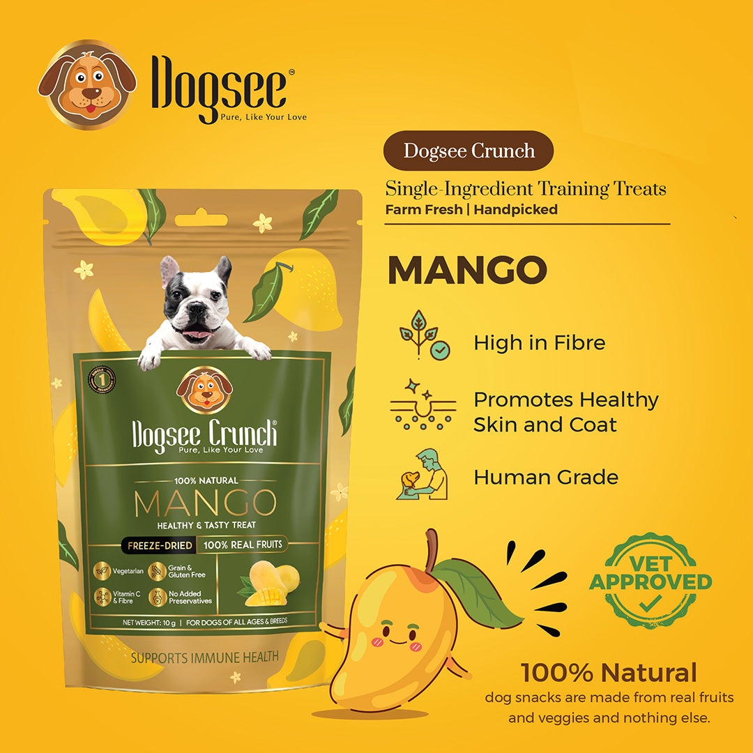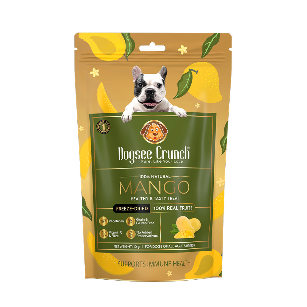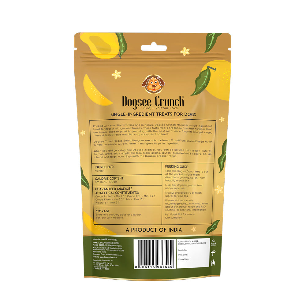 Dogsee Crunch Freeze-Dried Mangoes are rich in Vitamin C and Fibre. Fibre in mangoes helps in digestion and supports the gut microbiome. Vitamin C helps build a healthy immune system. Fibre in mangoes helps in digestion.