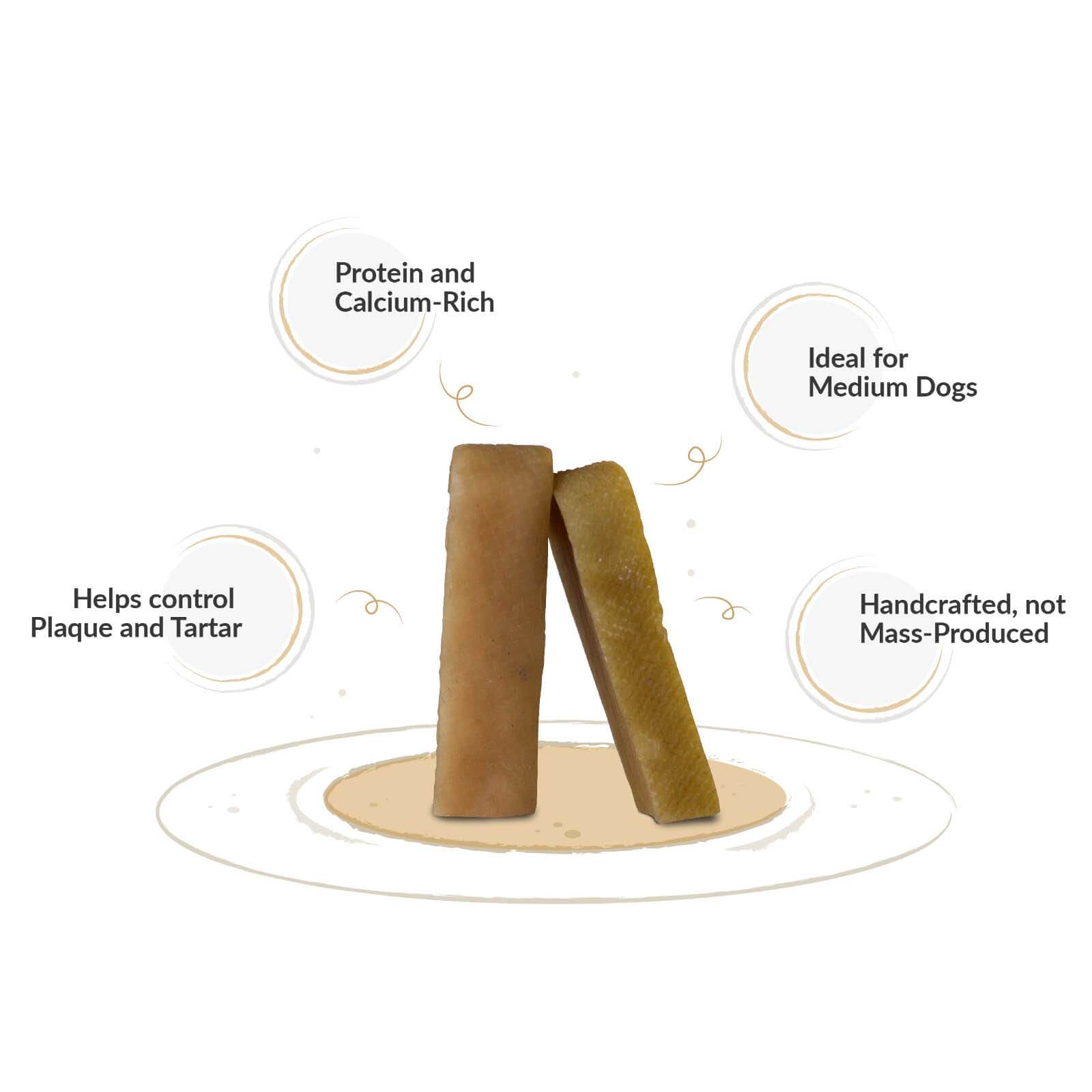 Compared to rawhides, antlers, and bully sticks, these chews are healthier alternatives - These Himalayan cheese chew treats are 100% natural and high in nutrition (59.2% protein and 5.2% fat). Being completely free from preservatives, added colours and chemicals, they are in stark contrast to the unhealthy rawhides which are processed with harmful chemicals. These treats become soft on chewing on them, so they’re good for your dog’s teeth and gums, as compared to antlers which are very hard.