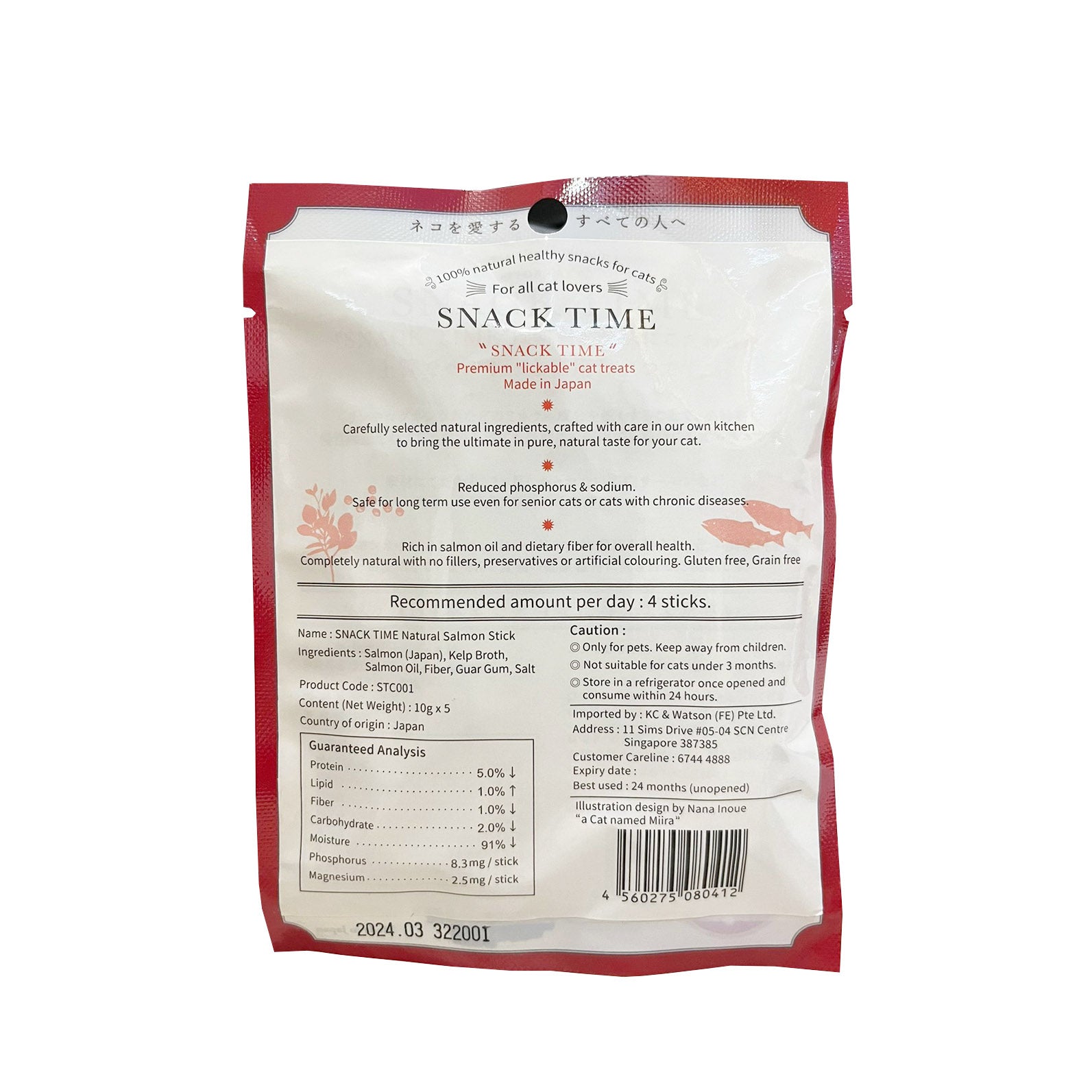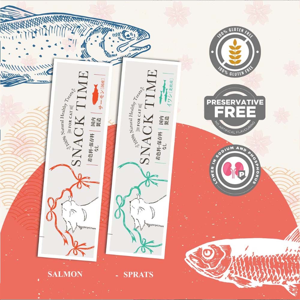 Indulge your cat with Snack Time 100% natural, healthy treat. Carefully selected premium human grade ingredients, Snack Time Natural Salmon Stick is rich in Salmon oil with dietary fiber for overall health. It is completely natural with no fillers, preservatives or artificial coloring. Gluten free, Grain free. Low in phosphorus and magnesium, safe for long term use even for senior cats or cats with chronic diseases with low appetite. Great as topper on its own, or a healthy complementary food that cats love!