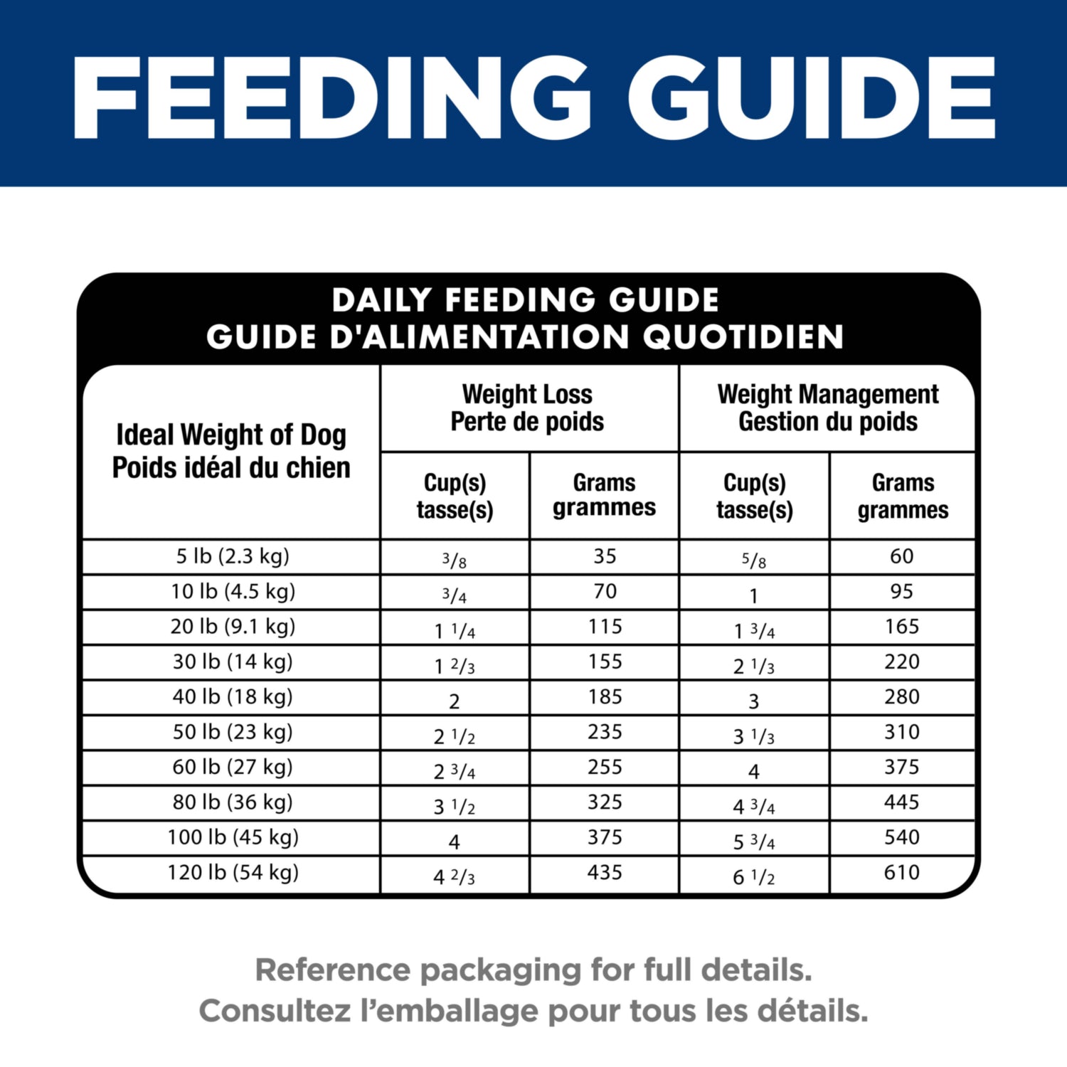 | Ideal Weight of Dog — lbs (kgs) | Amount per Day - cups (grams) - Weight loss | Amount per Day - cups (grams) - Adult maintenance |