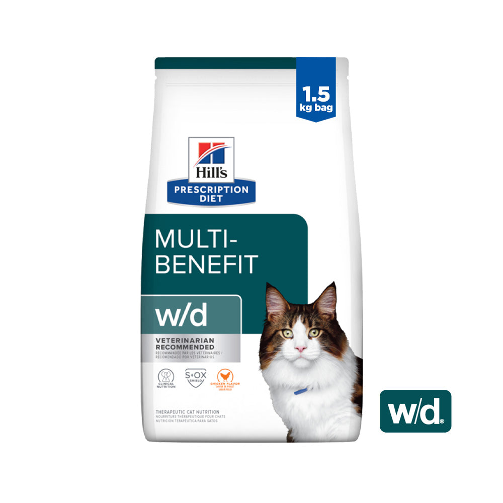 Hill's Prescription Diet w/d Multi-Benefit is a complete and balanced dry food that provides all the nutrition your cat needs. Please consult your veterinarian for further information on how our Prescription Diet foods can help your cat to continue to enjoy a happy and active life.