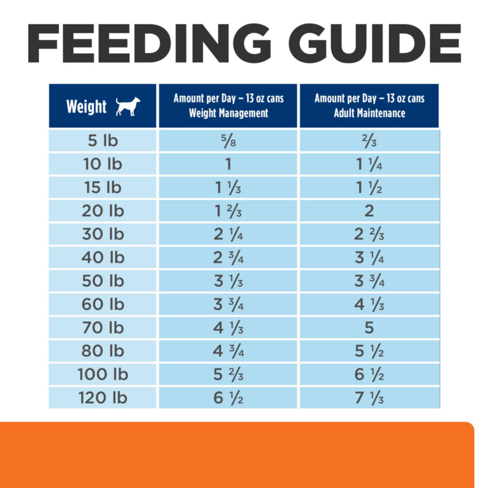 | Ideal Weight of Dog — lbs (kgs) | Amount per Day - 13 oz (370 g) cans - Weight Management | Amount per Day - 13 oz (370 g) cans - Adult maintenance |