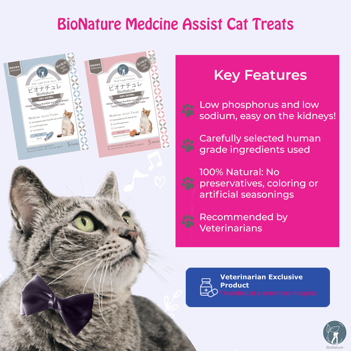 The first kidney-friendly cat treat that's 100% natural! Low phosphorus, low sodium, healthy snack that veterinarians confidently recommend. BioNature Medicine Assist Treats are great for cats who dislike medication. The perfect choice when your cat loses appetite, recovering from surgery or needs an energy booster. It is also perfect as a treat itself! Suitable for all ages and all breeds. Carefully selected human-grade ingredients, that are 100% Natural. No preservatives, No coloring agents, No artificial flavoring, Non-GMO, Grain free, Gluten free, Pork Free.