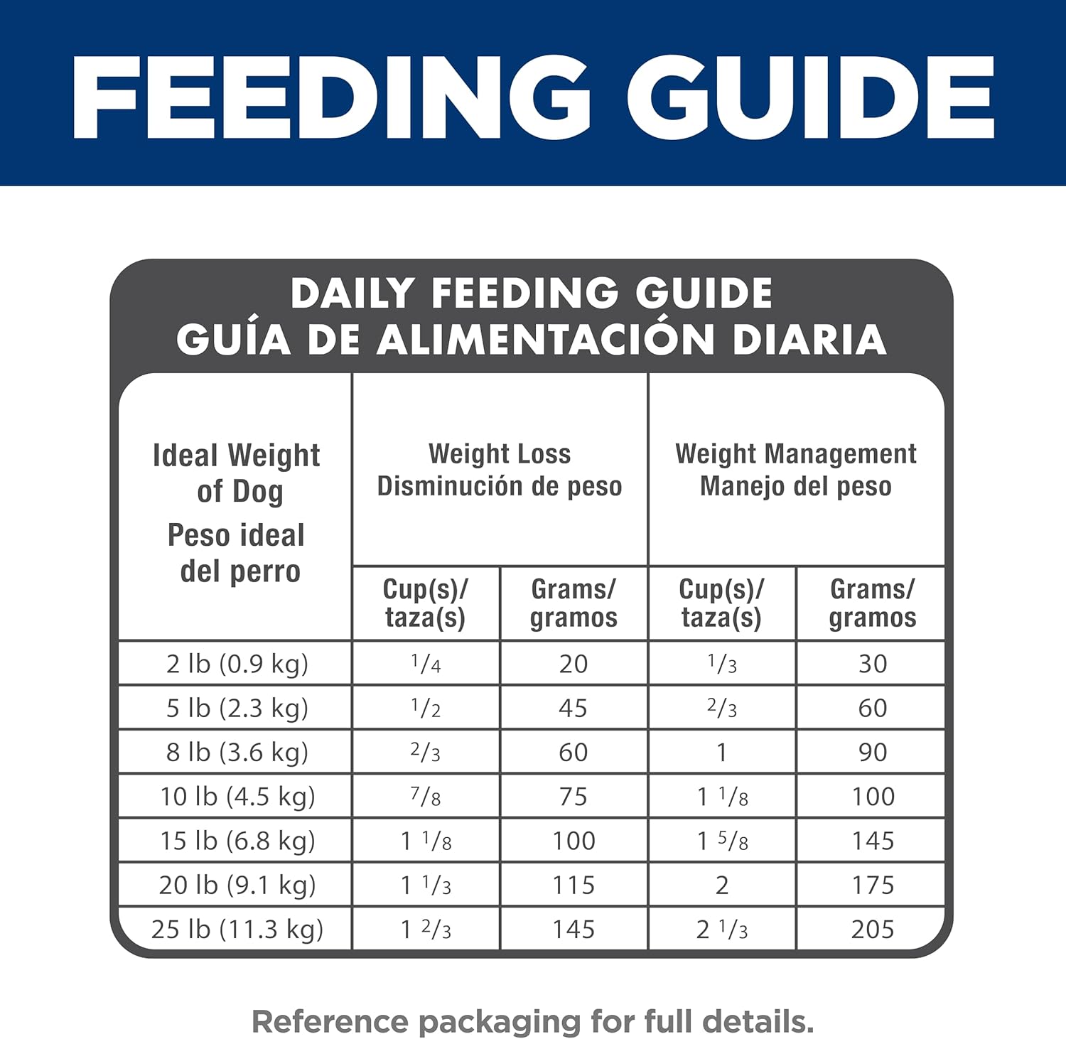 | Ideal Weight of Dog - lbs (kgs) | Amount per Day - cups (grams) - Weight loss | Amount per Day - cups (grams) - Weight Management |