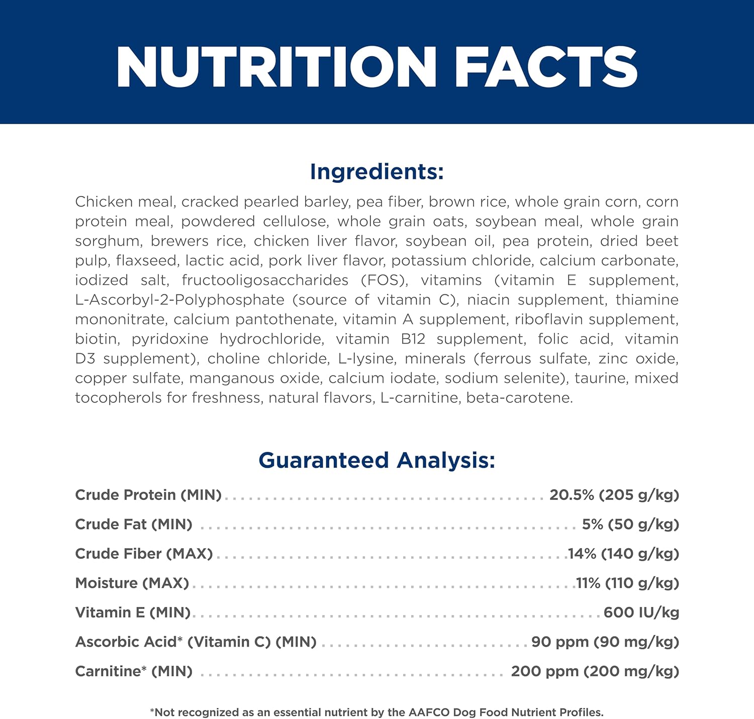 Chicken Meal, Cracked Pearled Barley, Pea Fiber, Brown Rice, Whole Grain Corn, Corn Protein Meal, Powdered Cellulose, Whole Grain Oats, Soybean Meal, Whole Grain Sorghum, Brewers Rice, Chicken Liver Flavor, Soybean Oil, Pea Protein, Dried Beet Pulp, Flaxseed, Lactic Acid, Pork Liver Flavor, Potassium Chloride, Calcium Carbonate, Iodized Salt, Fructooligosaccharides (FOS), vitamins (Vitamin E Supplement, L-Ascorbyl-2-Polyphosphate (source of Vitamin C), Niacin Supplement, Thiamine Mononitrate, Calcium Pantothenate, Vitamin A Supplement, Riboflavin Supplement, Biotin, Pyridoxine Hydrochloride, Vitamin B12 Supplement, Folic Acid, Vitamin D3 Supplement), Choline Chloride, L-Lysine, minerals (Ferrous Sulfate, Zinc Oxide, Copper Sulfate, Manganous Oxide, Calcium Iodate, Sodium Selenite), Taurine, Mixed Tocopherols for freshness, Natural Flavors, L-Carnitine, Beta-Carotene.