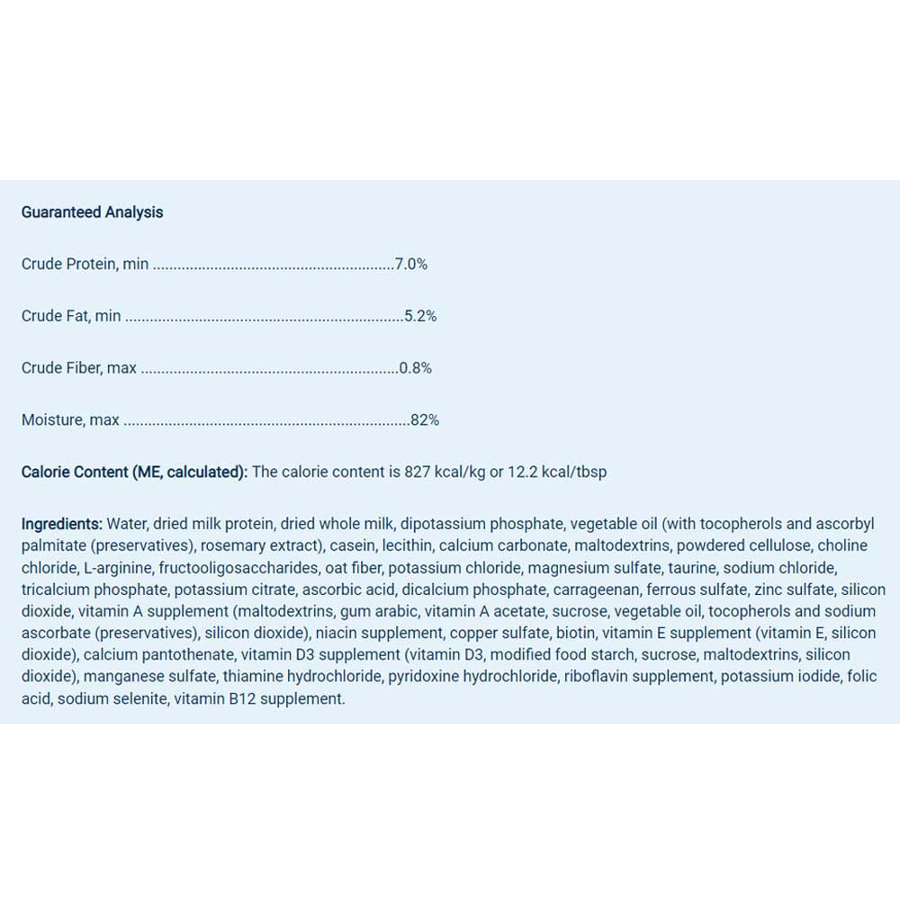 Water, dried milk protein, dried whole milk, dipotassium phosphate, vegetable oil (with tocopherols and ascorbyl palmitate (preservatives), rosemary extract), casein, lecithin, calcium carbonate, maltodextrins, powdered cellulose, choline chloride, L-arginine, fructooligosaccharides, oat fiber, potassium chloride, magnesium sulfate, taurine, sodium chloride, tricalcium phosphate, potassium citrate, ascorbic acid, dicalcium phosphate, carrageenan, ferrous sulfate, zinc sulfate, silicon dioxide, vitamin A supplement (maltodextrins, gum arabic, vitamin A acetate, sucrose, vegetable oil, tocopherols and sodium ascorbate (preservatives), silicon dioxide), niacin supplement, copper sulfate, biotin, vitamin E supplement (vitamin E, silicon dioxide), calcium pantothenate, vitamin D3 supplement (vitamin D3, modified food starch, sucrose, maltodextrins, silicon dioxide), manganese sulfate, thiamine hydrochloride, pyridoxine hydrochloride, riboflavin supplement, potassium iodide, folic acid, sodium selenite, vitamin B12 supplement.