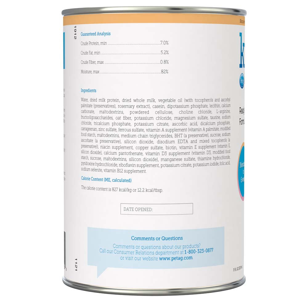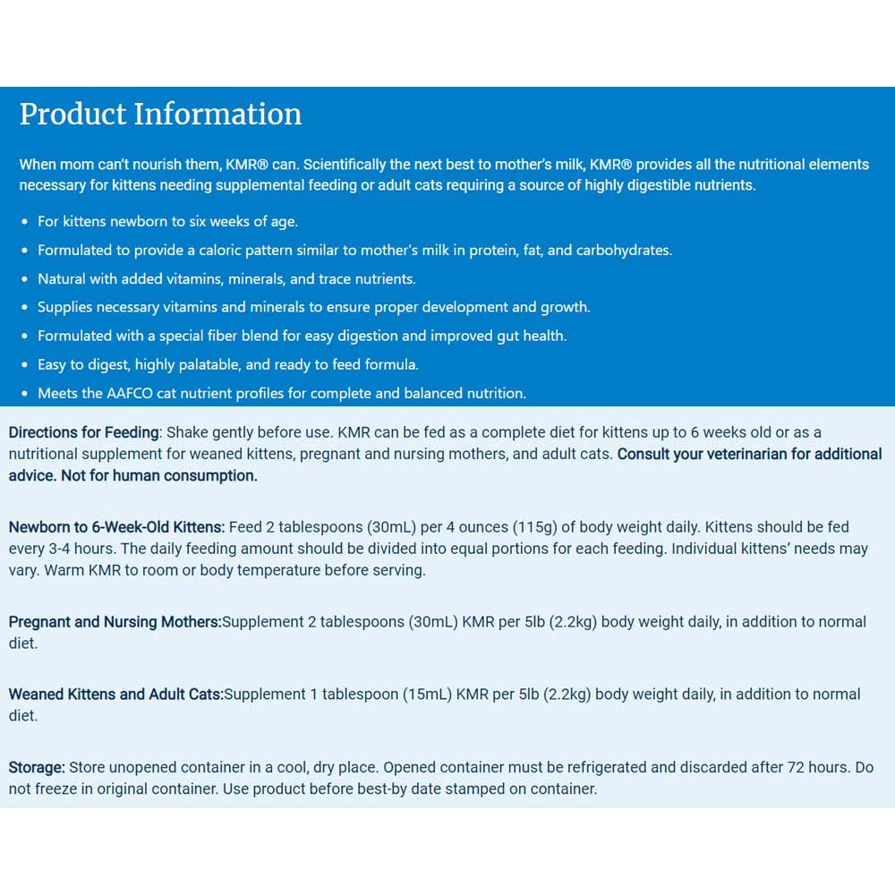 Directions for Feeding: Shake gently before use. KMR can be fed as a complete diet for kittens up to 6 weeks old or as a nutritional supplement for weaned kittens, pregnant and nursing mothers, and adult cats. Consult your veterinarian for additional advice. Not for human consumption.