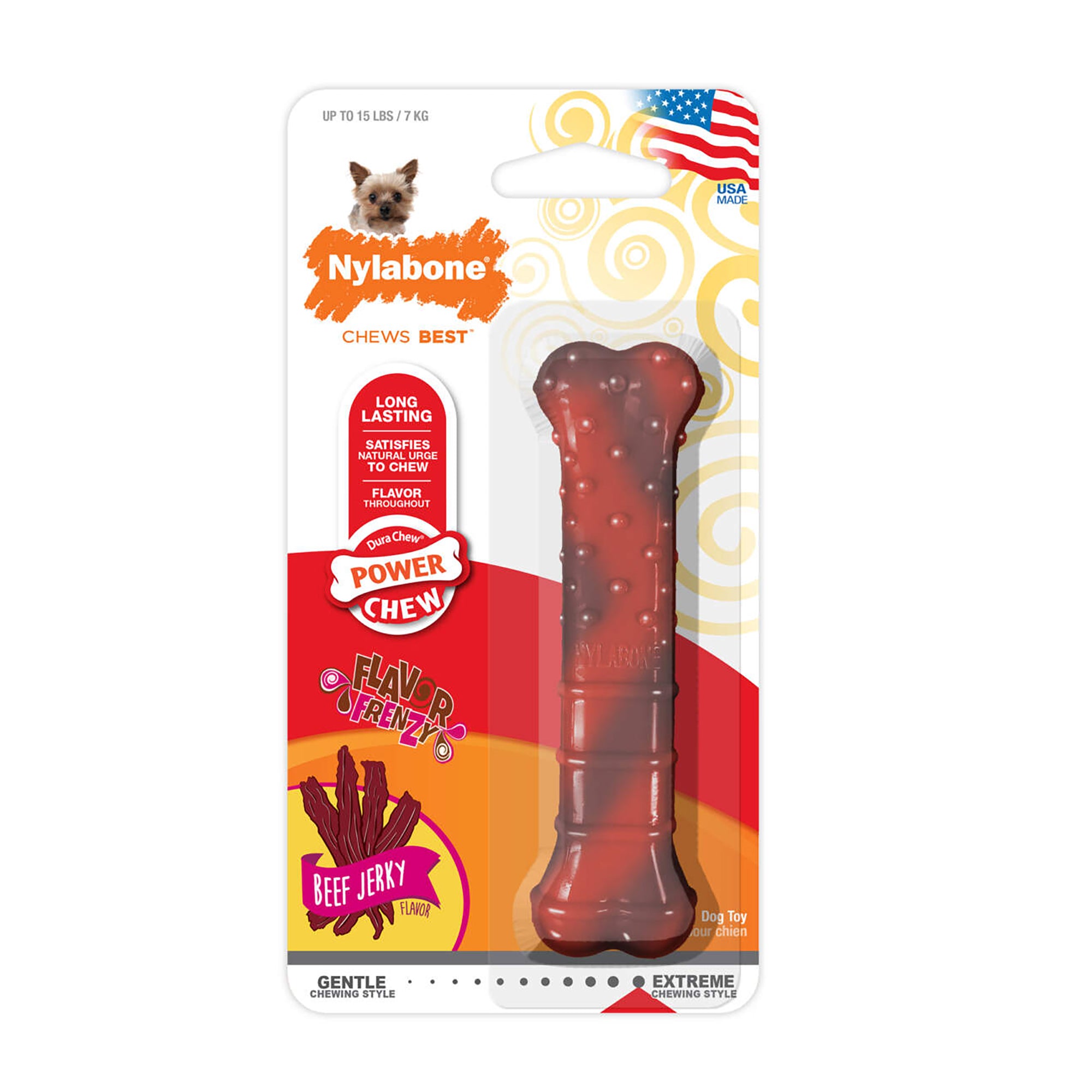 A big bone for your big-boned buddy! The Nylabone Power Chew DuraChew Beef Jerky Chew Dog Toy is built tough enough for larger dogs to chew to their heart's content. Made with durable nylon for long-lasting chomp-paw-tunity, this textured chew toy works wonders for preventing destructive chewing, boredom, anxiety and keeping those paw-ly whites nice and clean. Take the flavor, leave the calories; with a delicious beef jerky flavor, your big boy will love chomping all day long!
