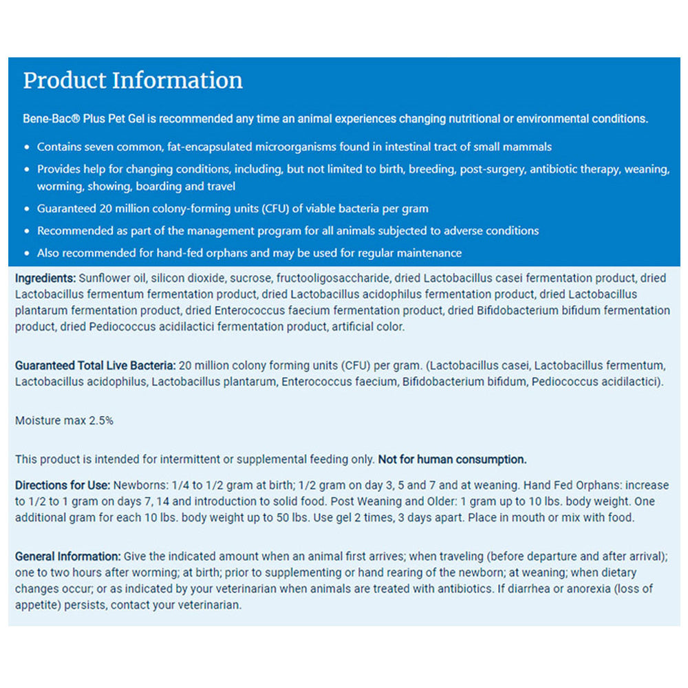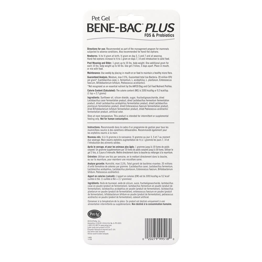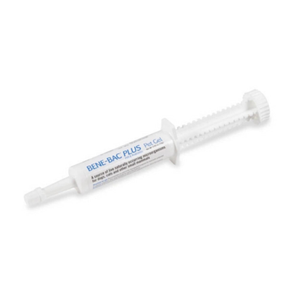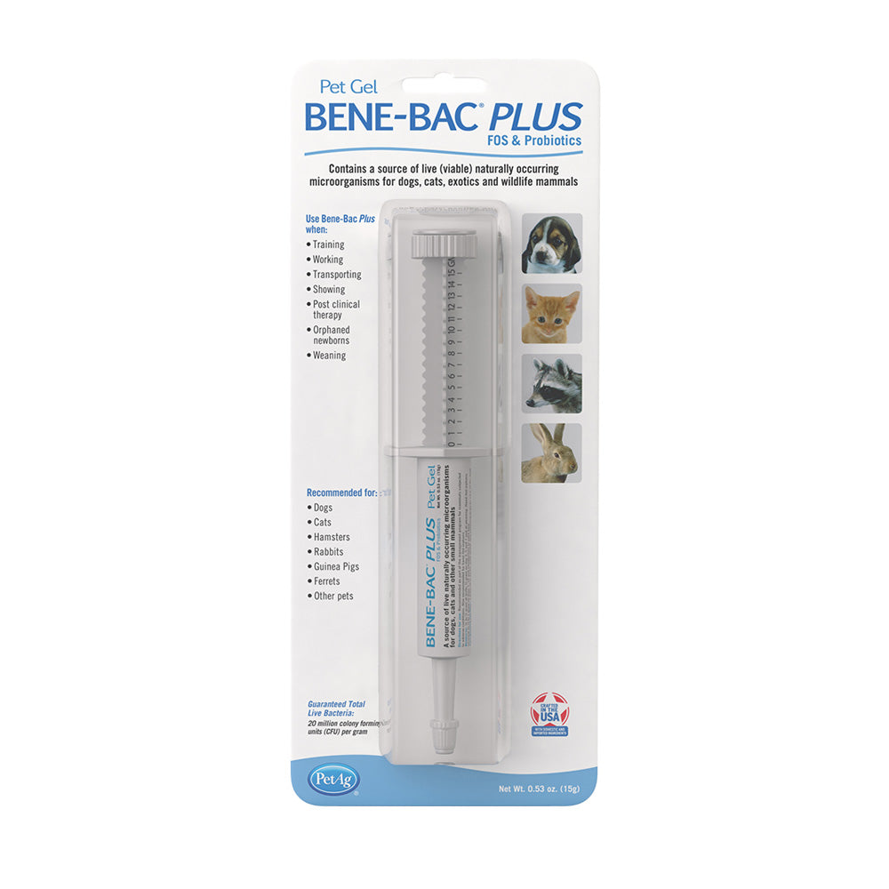 Bene-Bac Plus Pet Gel is a palatable gel in an easy-to-use, 15-gram syringe tube containing concentrated FOS and live, naturally occurring microorganisms. Formulated for pets that are experiencing changes in their diets or environments, and shocks such as: training, travelling, diarrhea, birthing and nursing, newborns orphaned or weaning surgery. Can be taken as a weekly supplement, and is suitable for a wide range of pets and animals such as dogs, cats, hamsters, rabbits, guinea pigs, ferrets, birds, reptiles, equines, and other livestock such as goats, sheep, cattle, and swine.