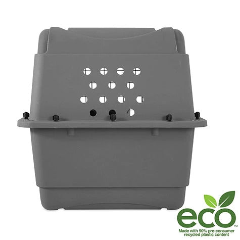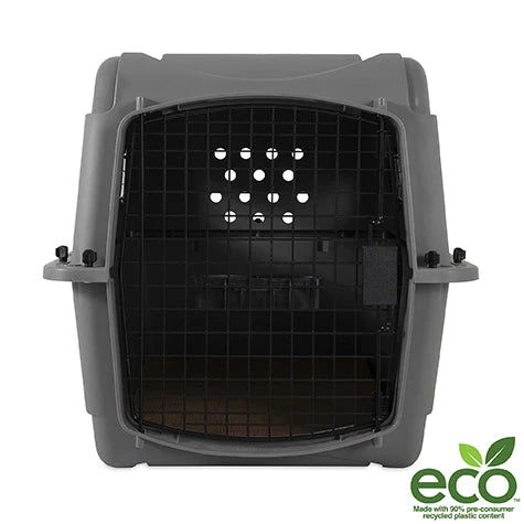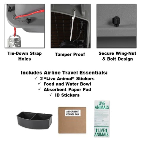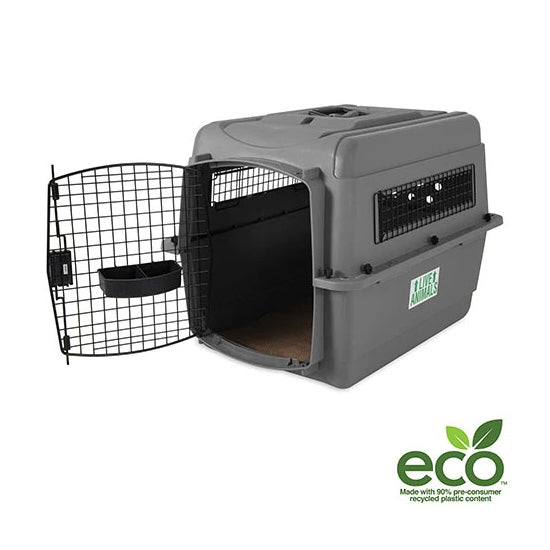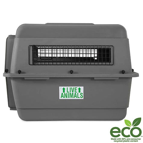 This heavy-duty travel kennel features high-strength construction made from eco-friendly plastic, a durable wire door with an easy-squeeze latch system that interlocks for added security, 360-degree wire ventilation windows for plenty of healthy airflow, non-corrosive metal bolts, and plastic covered wing-nuts for durable assembly. Available in a variety of sizes, the Sky Kennel is proudly made in the USA and ideal for dogs and cats. To make air travel smoother, each Sky Kennel comes with 2 "LIVE ANIMAL" stickers, 1 dual food & water bowl that attaches to the kennel door, 1 absorbent paper pad, and ID stickers. The Petmate Sky Kennel meets most air travel requirements, however, we always recommend that you contact your specific airline before traveling for verification of their specific requirements.