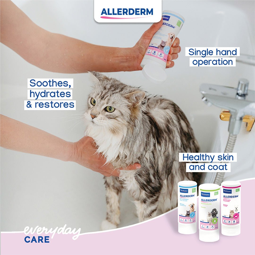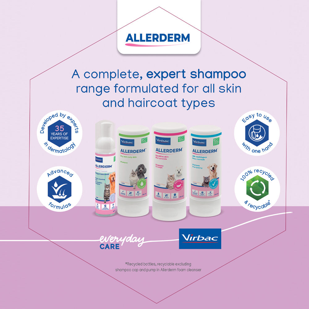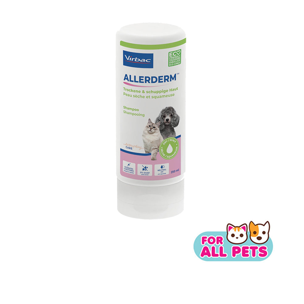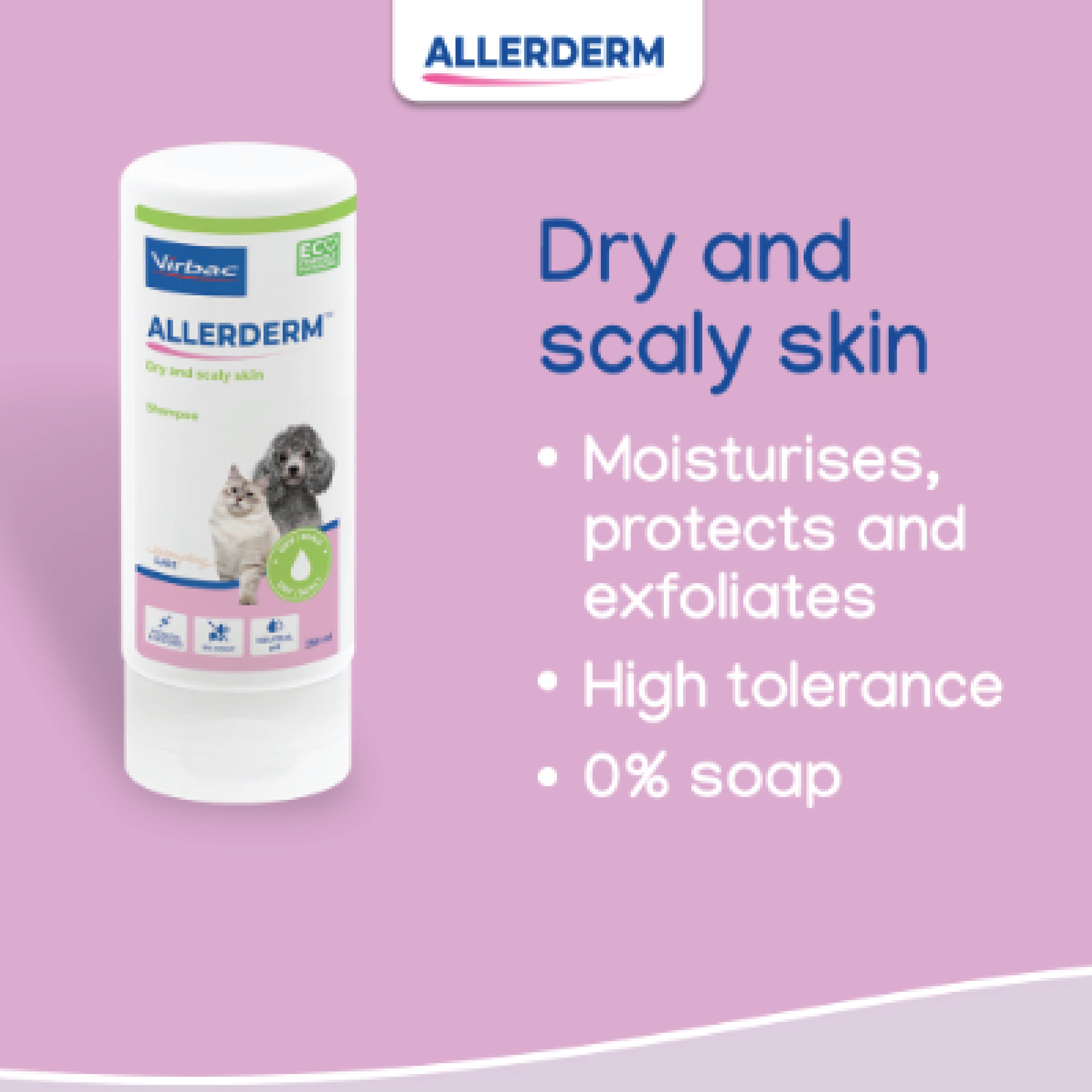 ALLERDERM Shampoo for dry & scaly skin is a gentle, soap-free, hypoallergenic and well tolerated shampoo designed for frequent use to optimise skin and coat condition of dogs and cats of all ages.